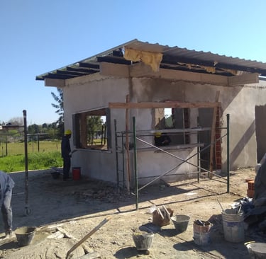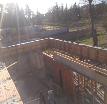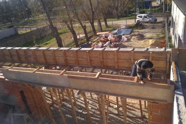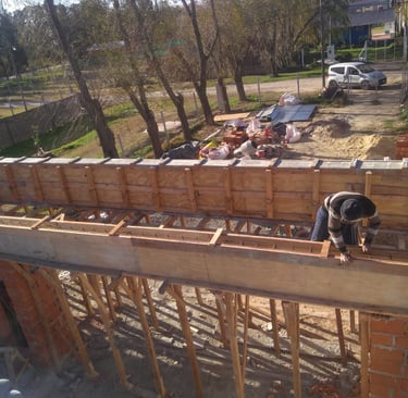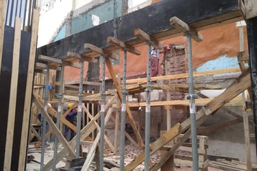 Refuerzo de vigas, columnas y elementos estructurales mediante encofrado y apuntalamiento, aplicados en viviendas y obras civiles de diversa escala.